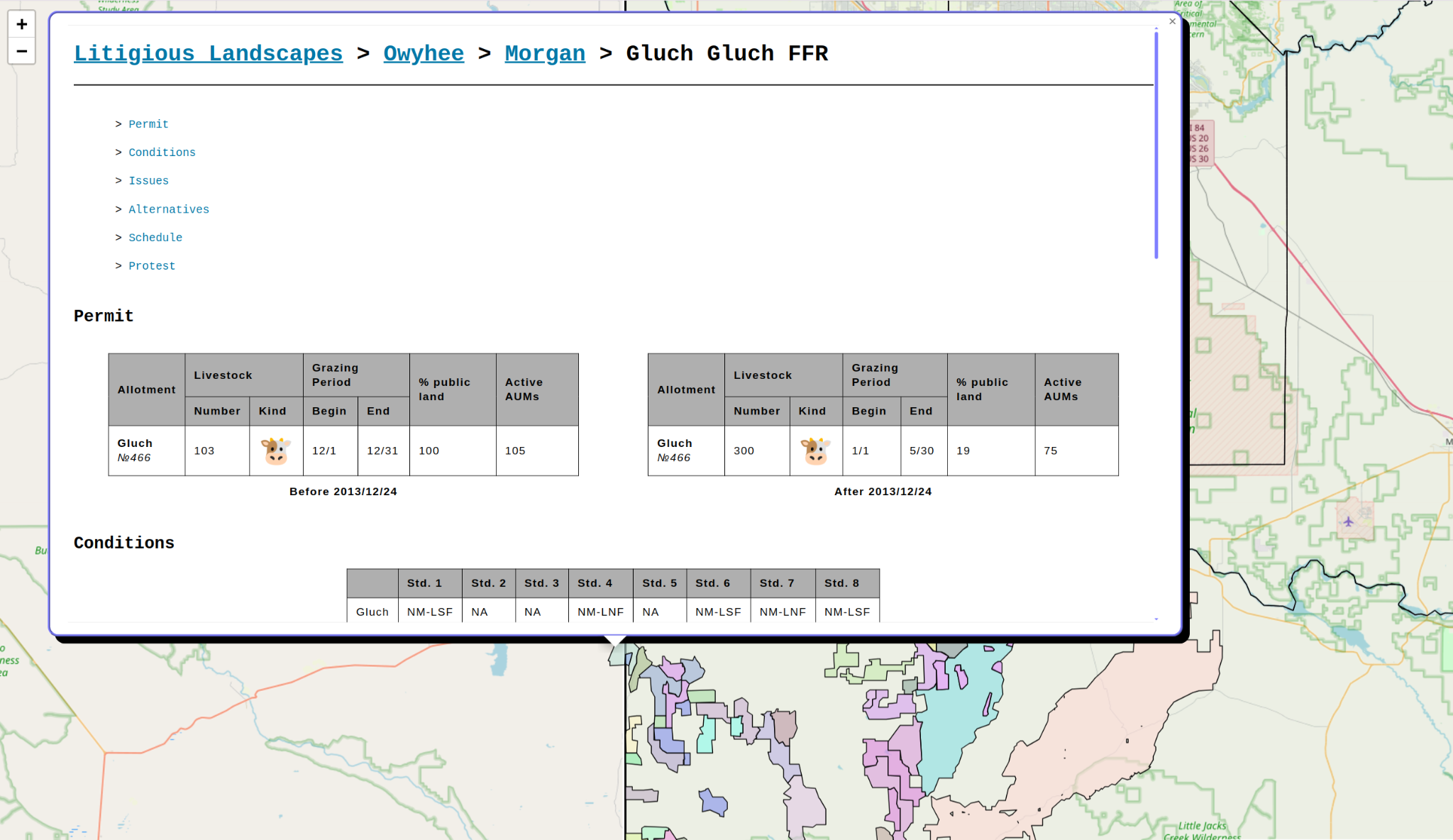 This was the fun part. I built a geospatial single page web application to present the encoded documents in a useful manner. Back when we were waiting on the FOIA, I found a geojson file with the land parcels that these lawsuits were being filed over. The geojson included fields for the Allotment Number, which let me map my encoded data to land parcels.